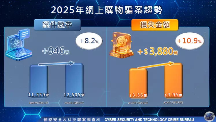 2025年本港共錄得12,505宗網上購物騙案,較2024年的11,559宗增加946宗,升幅達8.2%。