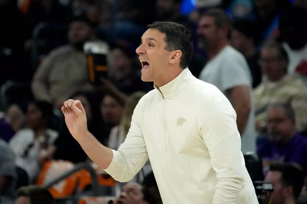 2026年4月27日周一,NBA季後賽首圈第四場比賽上半場,奧克拉荷馬城雷霆(Oklahoma City Thunder)主教練馬克·戴格諾特(Mark Daigneault)在鳳凰城對陣鳳凰城太陽(Phoenix Suns)時向球員發出指示。(美聯社圖片/Ross D. Franklin) AP圖片