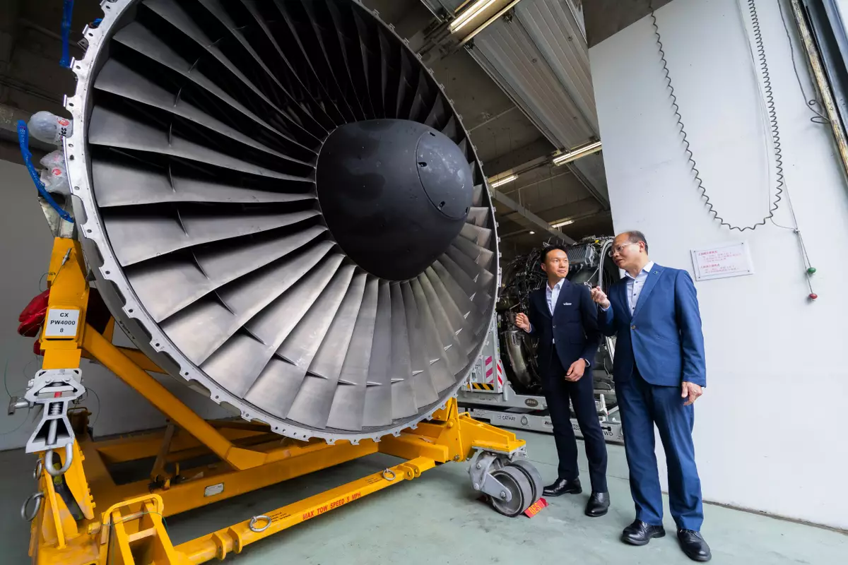 許焯彥(左)及盧志華(右)觀看飛機引擎。