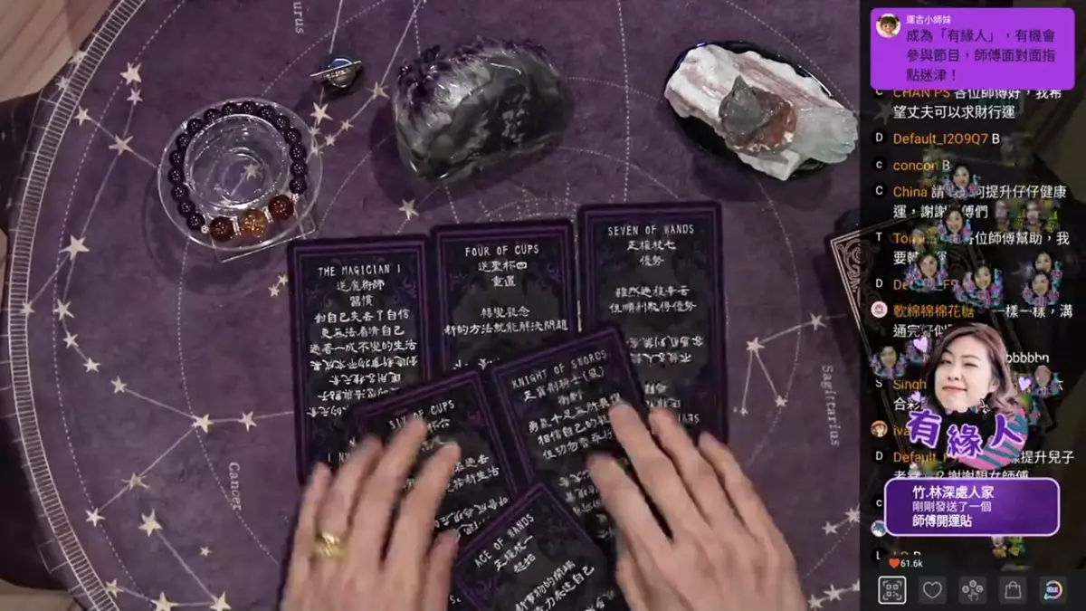 塔羅占卜師羅泳嫻(裸泳)開了塔羅牌局,牌中顯示Jinny是喜歡話事的一方,而且氣勢旺夫,她續說︰「老公自信心唔及老婆,夫妻關係顯示Jinny手持『正寶劍騎士』牌,就好似你攞住把劍行住佢,要經你鞭策佢先會做。」而老公手持的是「正權杖一」牌,顯示對方已經知道聽老婆話有發達。Jinny表示老公近日做事已較上心,每做決定都會徵詢自己意見。