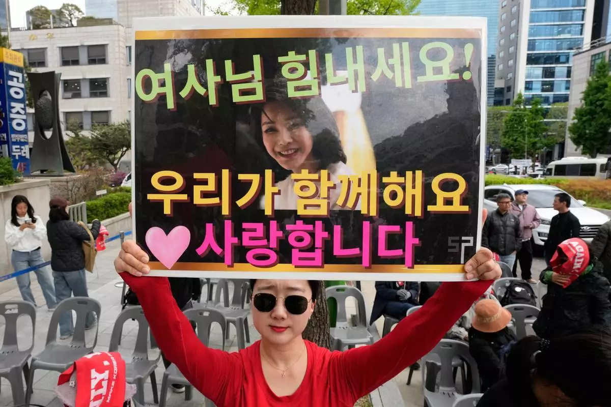 韓國首爾,2026年4月28日周二,韓國前總統尹錫悅的一名支持者在首爾高等法院外集會,舉起印有其妻子金建希肖像的橫額,上面寫著「夫人,堅強!我們愛你」。(美聯社圖片/Ahn Young-joon) AP圖片
