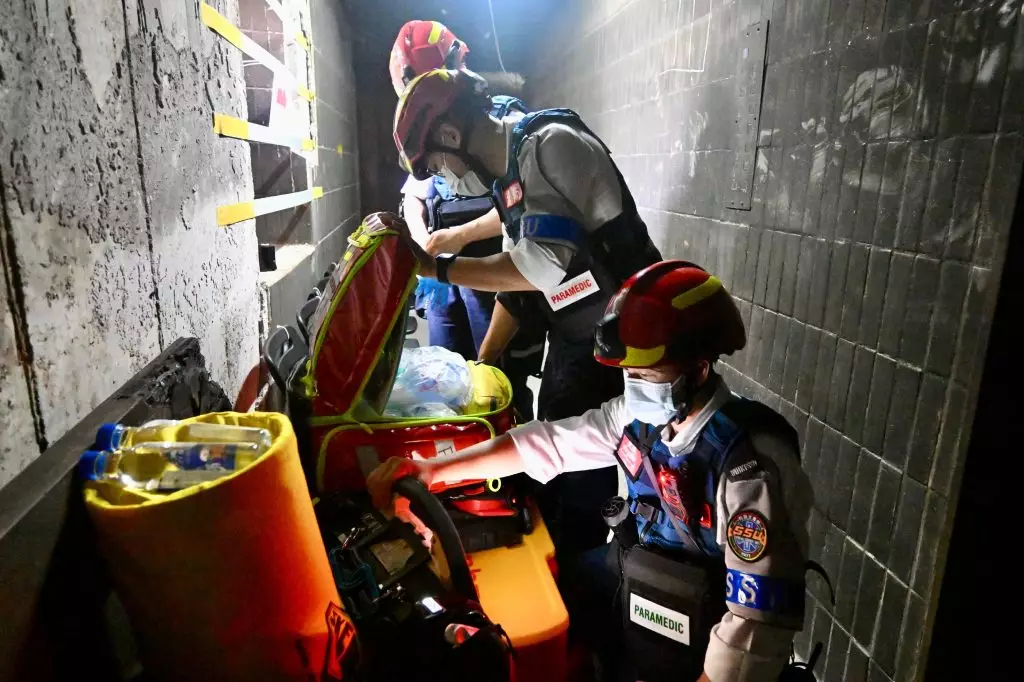 消防和救護人員在樓層候命,在現場為宏福苑上樓居民提供緊急和醫療服務。 政府新聞處圖片