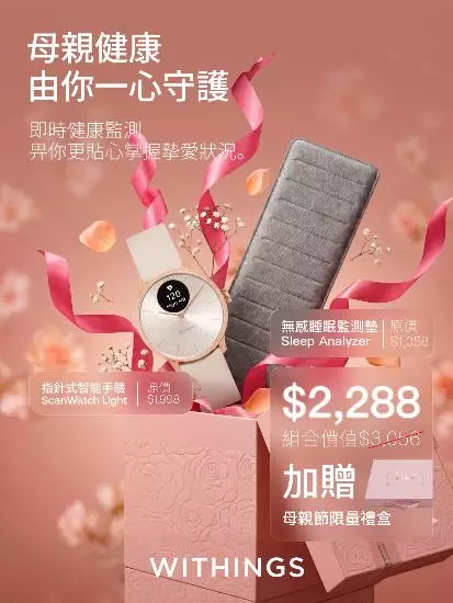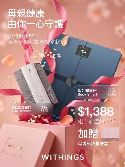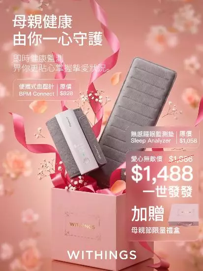 一年一度的母親節將至,孝順子女正忙於為母親挑選心意禮物。健康管理專家 Withings 特意推出三款母親節優惠套裝,讓子女能透過科技隨時隨地關注母親的身體狀況。由 2026 年 5 月 1 日至 5 月 17 日,相關套裝將以低至 75 折的優惠價發售,涵蓋血壓、睡眠及體重監測等多方面功能。