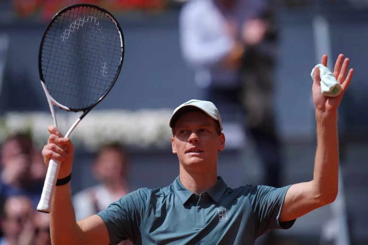 2026年4月28日,周二,意大利球手贊尼克·冼拿在馬德里網球公開賽十六強賽中擊敗英國球手卡梅倫·諾里後抬頭望向觀眾。 (美聯社圖片/Manu Fernandez) AP圖片