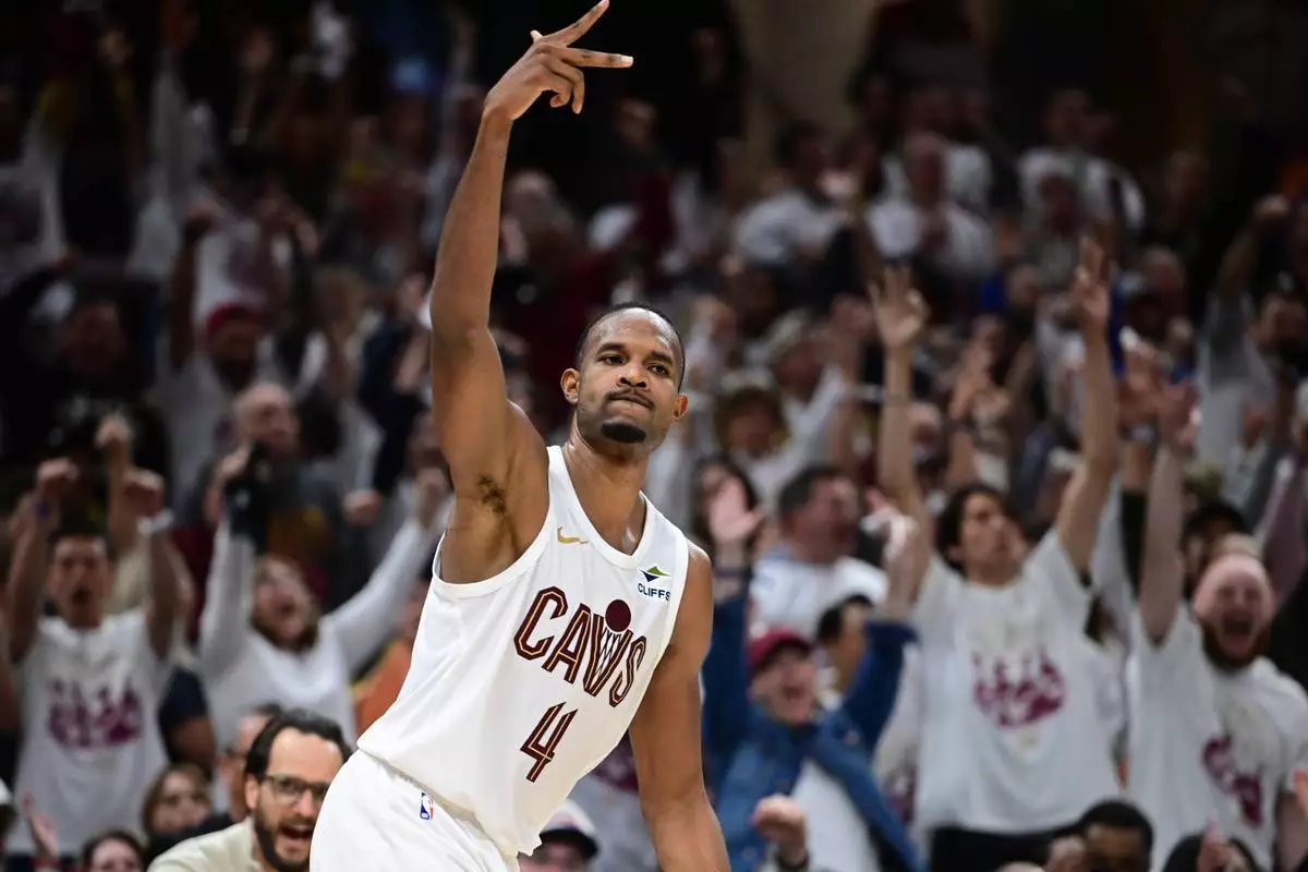 2026年4月29日周三,克里夫蘭騎士隊中鋒莫布利(Evan Mobley)在NBA季後賽首圈系列賽第五場下半場,射入三分球後作出反應。(美聯社圖片/David Dermer) AP圖片