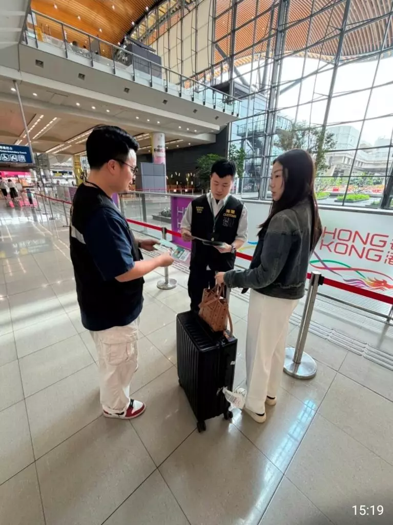 海關人員在深圳灣口岸派發宣傳單張。 政府新聞處圖片