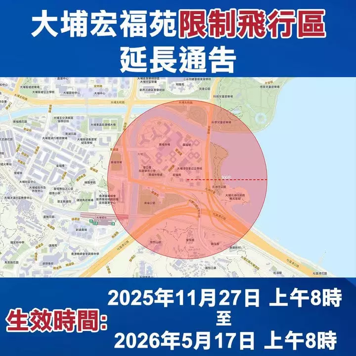警務處宣佈,為保障公眾安全,已將大埔宏福苑範圍的「限制飛行區」延長。限制時間將由2026年5月4日上午8時,延長至2026年5月17日上午8時。
