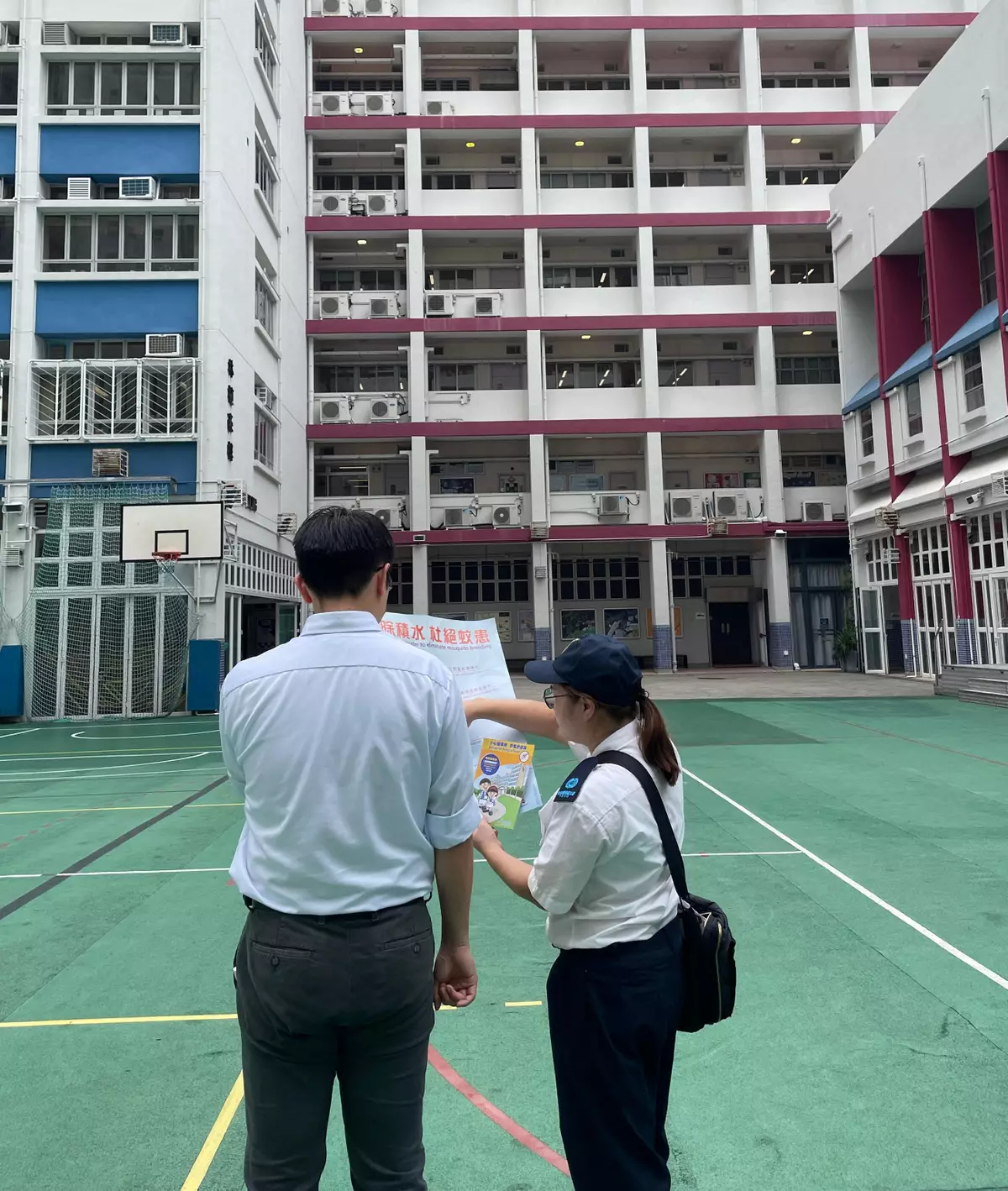 食環署人員巡視東區筲箕灣一學校,給予校方人員防蚊控蚊建議和技術支援。政府新聞處圖片