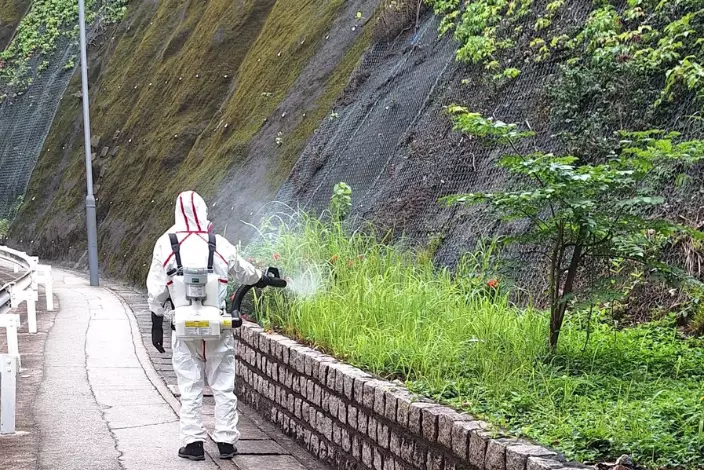 食環署承辦商人員在葵青區葵涌東一帶以霧化處理方式滅蚊。政府新聞處圖片