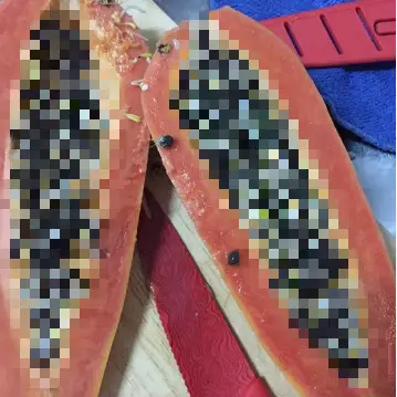 從相片可見這個木瓜的木瓜籽已經開始發芽,長滿密密麻麻的白色芽,不仔細看還以為是木瓜長滿「蛆蟲」,令人噁心。