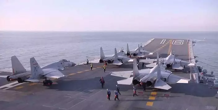遼寧艦與數艘驅護艦組成編隊,先後開展了建立偵察預警體系、空中攔截、對海突擊和防空反導等項目演練,多批次殲-15艦載戰鬥機掛載實彈,飛赴演習海空域實施打擊行動。
