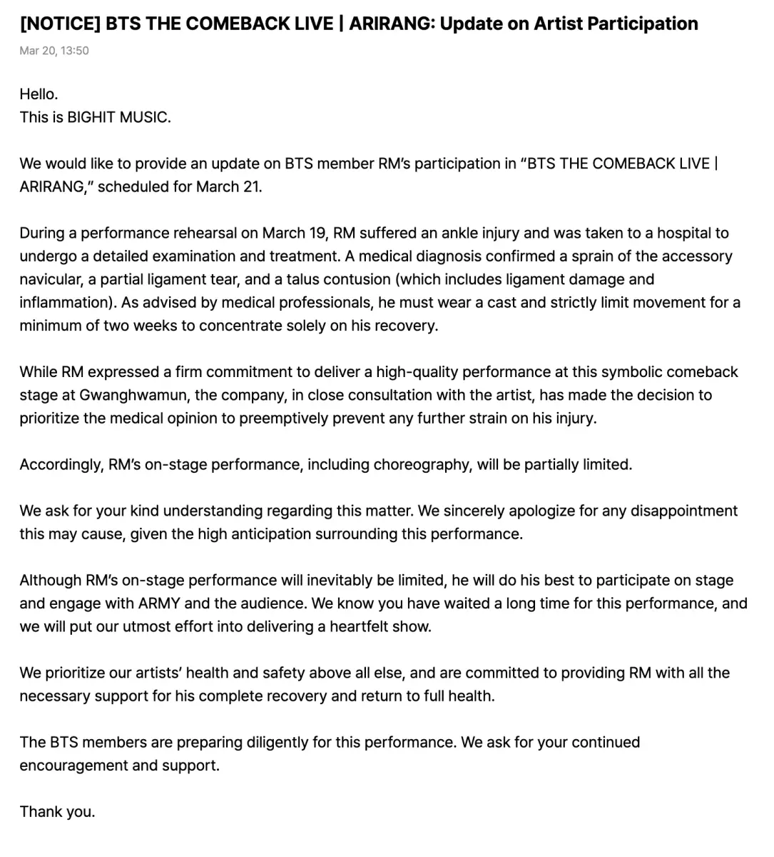 儘管RM本人強烈希望能在光化門這個充滿象徵意義的回歸舞台上全力演出,公司與藝人經過密切討論後,仍決定優先遵從醫療專業意見,以避免傷勢惡化。因此,在明日的《BTS THE COMEBACK LIVE | ARIRANG》中,RM的舞台表演(特別是編舞與動作部分)將部分受限。公司表示:「雖然RM的舞台表現難免受到限制,但他將盡最大努力參與演出,並與ARMY及現場觀眾互動。」同時也向粉絲致歉,懇請大家理解,並強調將全力支持RM徹底康復,早日恢復健康。