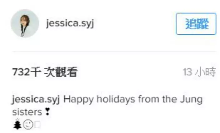 Jessica在Instagram上載與Krystal齊齊整古做怪的大熱Boomerang影片:「鄭氏姐妹祝大家聖誕節快樂。」片中Krystal身穿格紋毛衣拿著相機,Jessica則在她身後喝著咖啡,不時擺出搞鬼表情。二人平時也愛在社交平台上晒合照展現姊妹情深的一面,粉絲看得不亦樂乎。