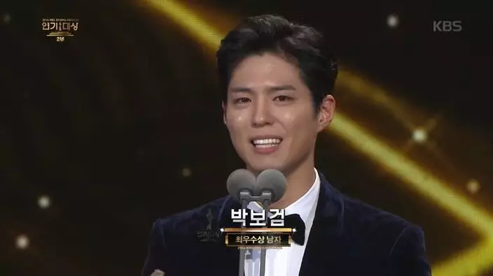 朴寶劍擊敗宋一國、李東健、李尚允等大前輩,與朴新陽共同奪下「男子最優秀獎」,驚喜奪獎的他未說感言前便落淚,更謙虛的表示自己的名字能和前輩放在一起,已是榮幸,想不到能獲獎,接著感謝所有曾經幫助過自己的人。