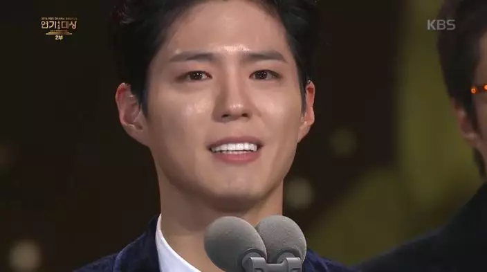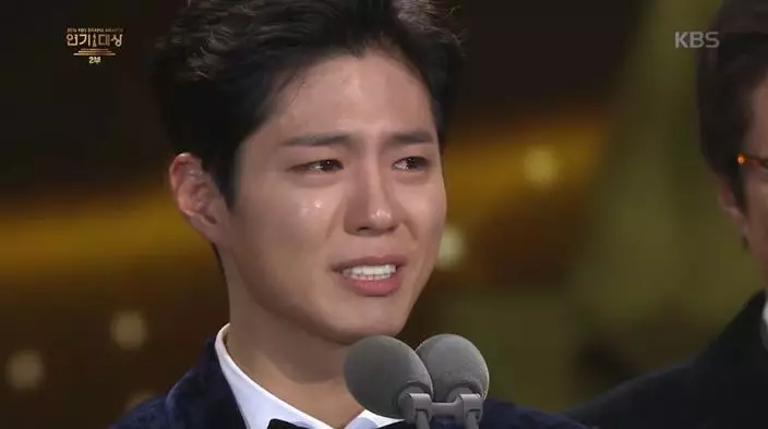 韓國演員朴寶劍在昨日「KBS演技大賞」中擔任主持人,同時奪得最佳情侶賞、男子人氣賞和男子最優秀賞三項大獎,致詞時忍不住落淚,不過台下的同門師兄宋仲基竟哭得比他更厲害。