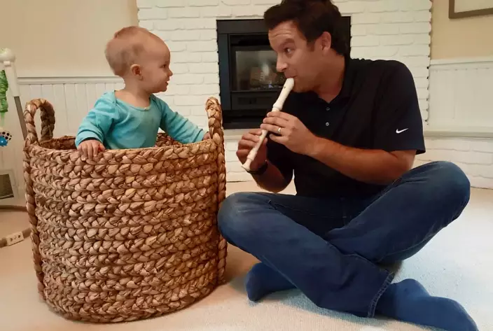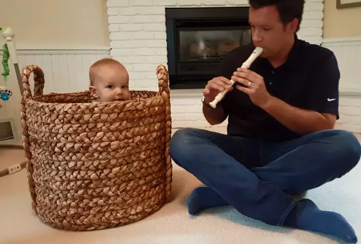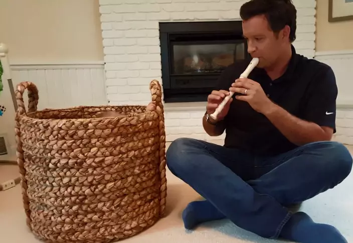 美國中西部北達科他州一位爸爸,拍攝了一段短片,顯示他安在家中裡吹奏牧童笛(吹到走音是正常的),隔籬放著一個大籃子,個架勢有幾分似印度的弄蛇術。