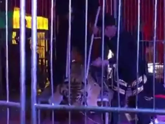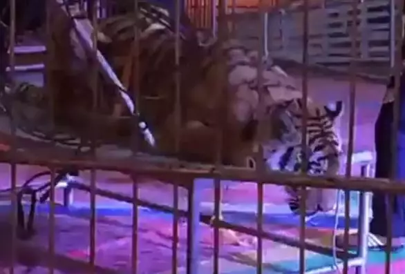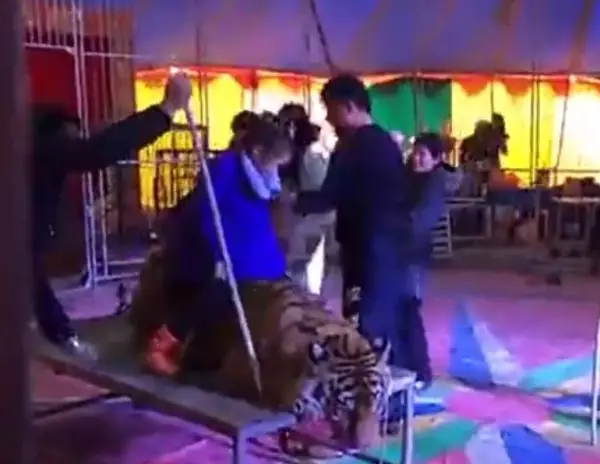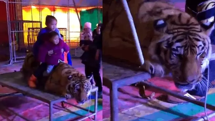 內地網上流傳片段,本月8日湖南省益陽馬戲團大棚內,工作人員將一隻東北虎五花大綁,牢牢綁在平台上,供遊客騎在虎背上拍照。馬戲團又將老虎牢牢鎖在長方形桌上。主持人拿著咪不停慫恿入場遊客「 騎在老虎頭上多麼瀟灑!」 不少人走到老虎身旁拍照,當中更不乏家長將子女抱起,放在老虎背上拍照。