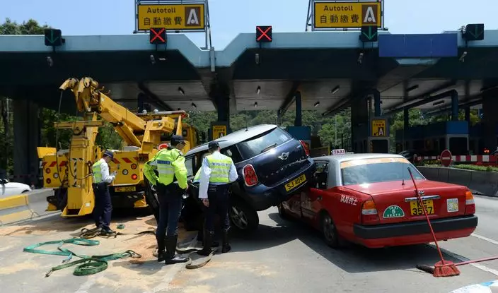 早上約10點,一架的士及Mini Cooper私家車,在將軍澳隧道入將軍澳方向收費廣場相撞。