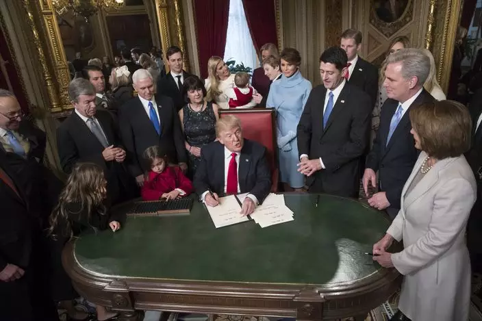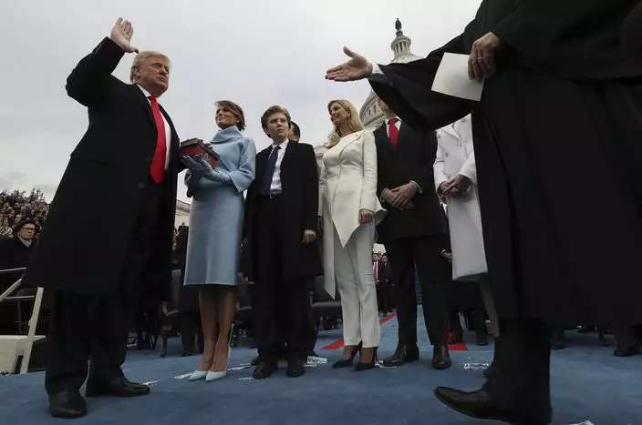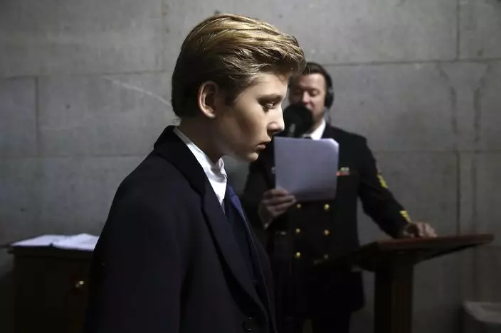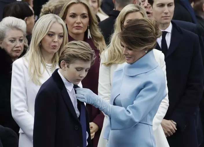 美國總統特朗普今日宣誓就職,一家總動員參加典禮。特朗普10歲小兒子巴倫(Barron Trump)再度發揮搶鏡本色。今次巴倫在爸爸就職禮上有時睡眼惺忪,有時賣萌發呆,有時向父母撒嬌,又在父親簽署文件時逗外甥玩,孩子氣的表情成為焦點。