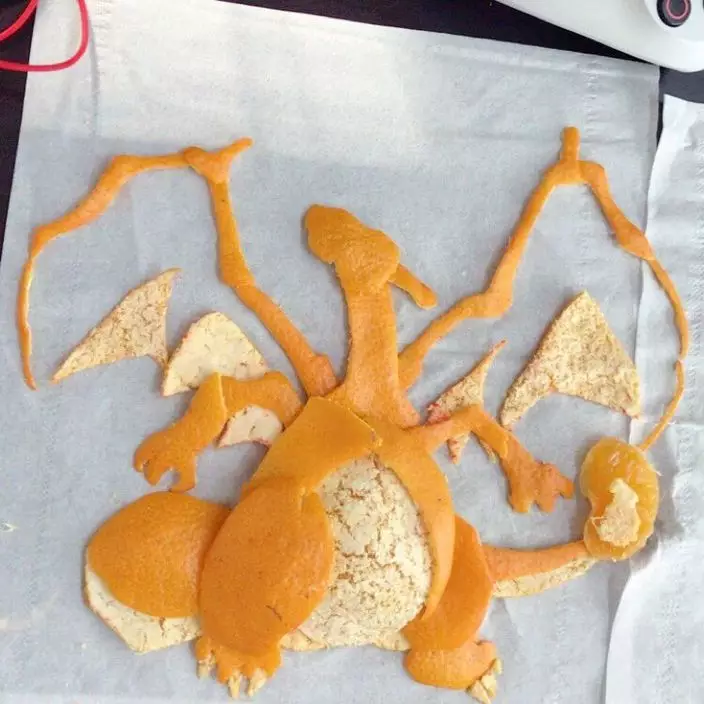 日本一位網友於吃橙後,把原為垃圾的橙皮撕成不同大小及形狀,並拼砌成寵物小精靈中的噴火龍,更把橙肉放於其尾部作火種。照片獲不少網友讚好及分享,有網友表示:「高手都在民間」、「究竟練習了多久?」、「每天也吃橙嗎?」