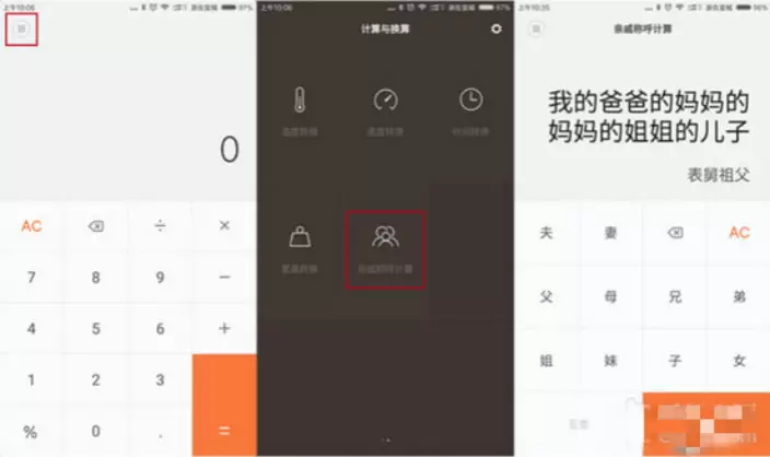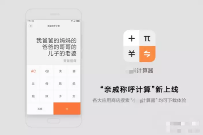 這款應用設計的界面真的就是計算器,只是數字鍵被「夫」、「父」等稱謂取代,羅列出各種血緣關係。只要依照血緣關係層層疊加,即可實時計算對方的準確稱呼。比如輸入「我的爸爸的媽媽的媽媽的姐姐的兒子」,就可得出結果「表舅祖父」。成功解決年輕人尊稱長輩的困擾。