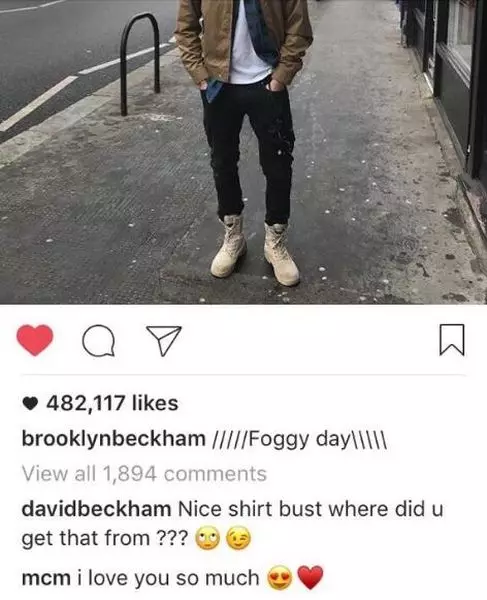 其實這已經不是Brooklyn第一次被老竇篤爆,他曾在Instagram分享穿著靚衫的自拍,說:「Rocking the old school Ralph Lauren(服裝品牌)」,呃咗幾十萬個like。其中碧咸也留言說:「係就係靚衫,不過你從哪裡得來的?」暗指件衫係佢俾囝囝的。