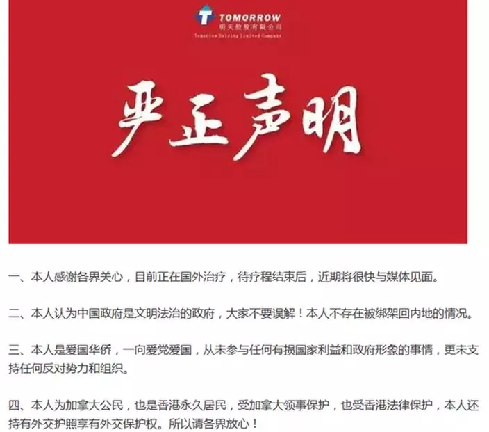 聲明又說,自己一向愛黨愛國,從未參與任何有損國家利益和政府形象的事情,更未支持任何反對勢力和組織,而他是加拿大公民,也是香港永久居民,受加拿大領事及香港法律保護,亦持有外交護照享有外交保護權。