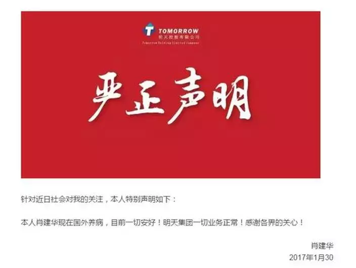 新浪財經網中午再刊登肖建華的聲明,指他不存在被綁架回內地的情況,目前正在國外治療,近期將很快與傳媒見面。