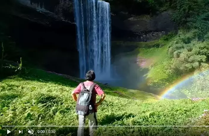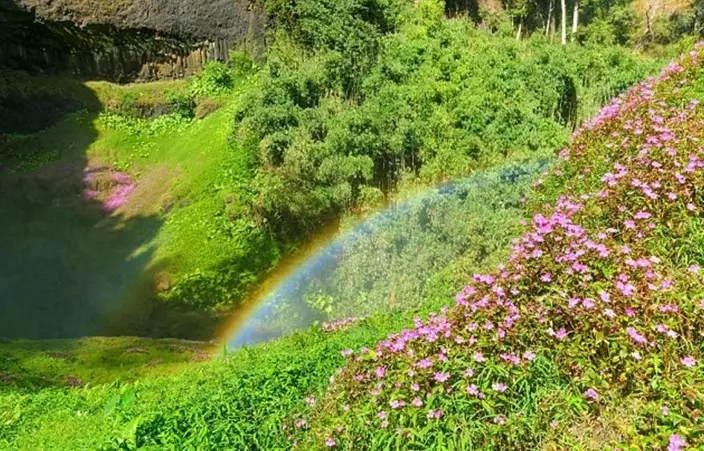 結果當走到盡頭時,宛如桃花源的美景盡入眼簾,仙境一般的綠色世界,畫面震撼,讓他非常震驚,他發現,這道雙彩虹是因為瀑布的水流,拍擊到岩石上濺起的水霧形成的。