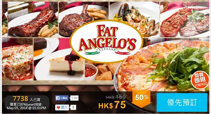 另一個團購平台BeeCrazy曾推出價值75元的200元Fat Angelo's現金券,根據網頁資料,已出售逾7千張優惠券。
