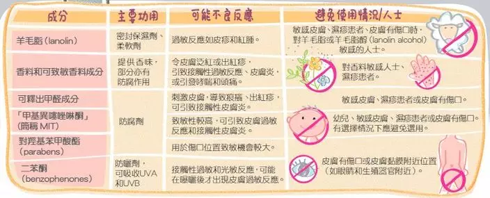 消委會搜集市面55款成人用身體潤膚乳及6款供嬰幼兒及成人用的潤膚乳,查看成分和標籤資料,發現當中不少成分可能令皮膚出現過敏或刺激反應,包括可釋出甲醛防腐劑、防曬劑及香料等,而聲稱適合嬰幼兒使用的潤膚乳中,有樣本標示含有尿素,若濃度高或可能令嬰幼兒皮膚有刺痛的感覺。