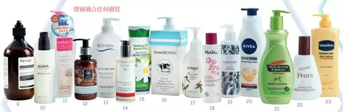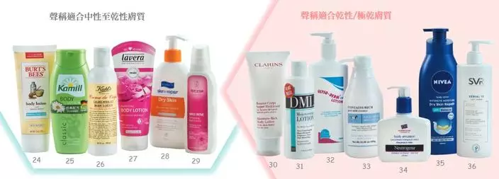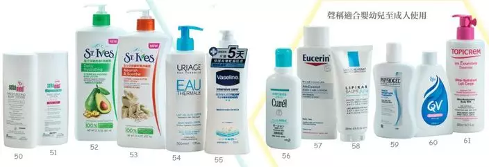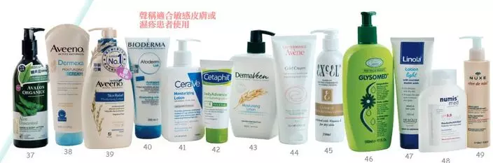 「ecopureecopure」、「ANNECY 透明質酸羊脂潤膚乳」、「M&S Beauty Floral Collection Lavender Moisturising Hand & Body Lotion」、「 洛士健維他命E護膚乳 」、「 佳善護膚露」、「 露得清潤膚乳霜 」和「優潔寶羊毛脂潤膚露」。當中「優潔寶羊毛脂潤膚露」還標示適合濕疹患者使用。