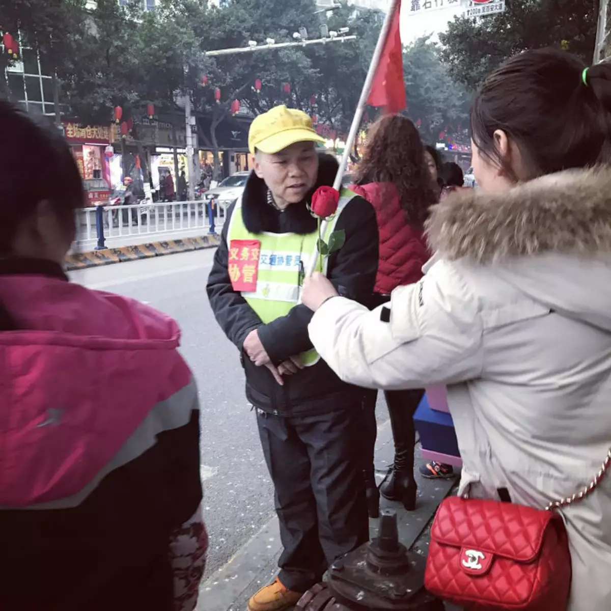 正在執勤的交通協管員收到玫瑰笑得非常燦爛。