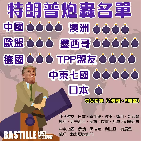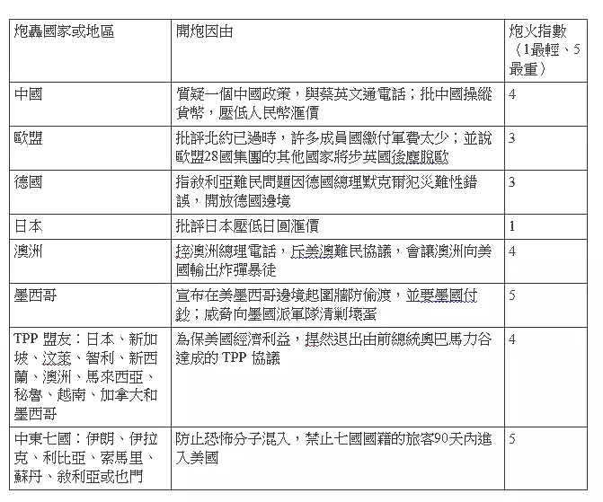 但這只為他的開火紀錄加添一小筆,因過去兩周,無論是盟友還是不友好國家,他罵過或動手得罪的已超過40個,此包括歐盟28國、TPP協議除美國外的11國、即時禁止入境3個月的7個中東國家,他個別則再向德國、日本、墨西哥等施壓(見表)。