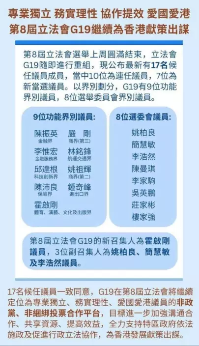 G19新召集人霍啟剛日前就宣布,新G19有17個議員,當中有10名連任議員,7名新當選議員。若以界別劃分,就有9人為功能界別議員,8人來自選委會界別。