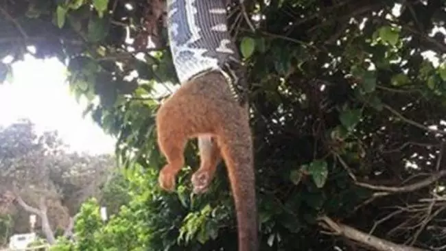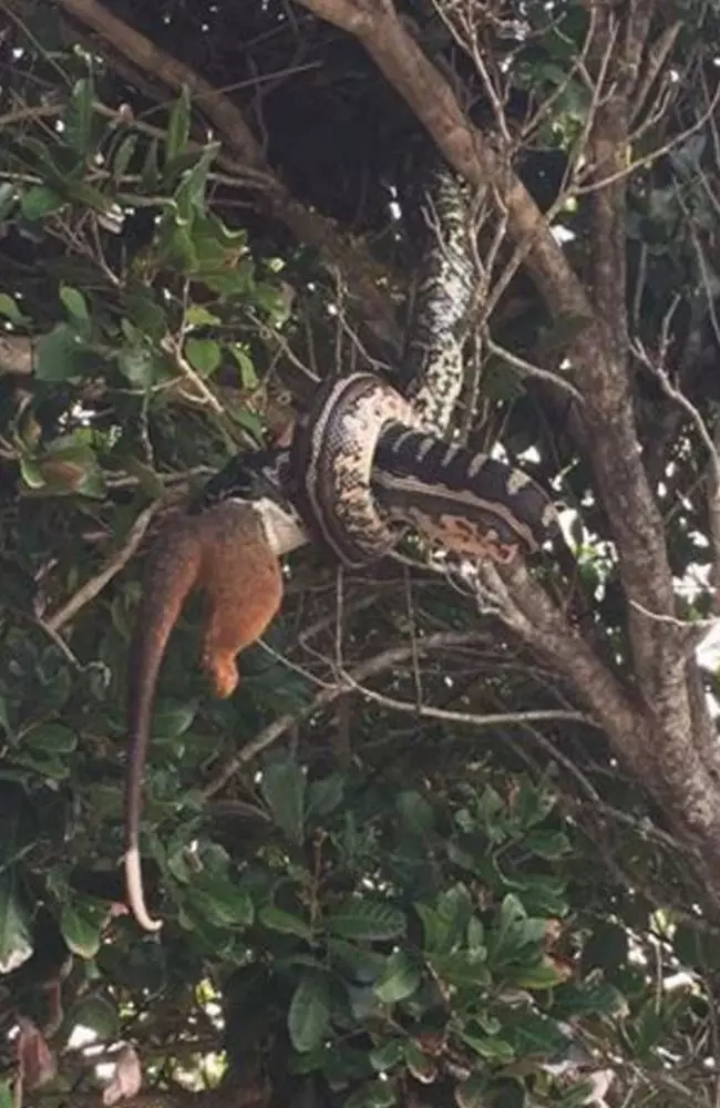 兩名澳洲遊客於本周日發現一條吊掛在樹上的巨蟒正在吞噬一隻負鼠,場面駭人。