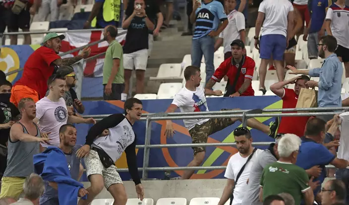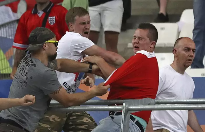去年歐國盃俄羅斯和英格蘭球迷在馬賽球場上互毆(AP圖片)