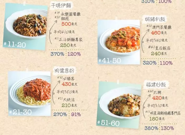 鈉含量第二高為干燒伊麵,每100克含410毫克鈉,而葵芳新都會御苑每百克只有500毫克鈉,其後為肉醬意粉、乾炒牛肉河粉、焗豬扒飯和福建炒飯,每100克的平均鈉含量介乎350毫克至310毫克。