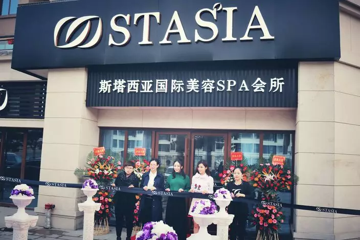 袁紫僑(右二)與常一嬌(中)出席美容自家品牌山東店的開幕儀式。