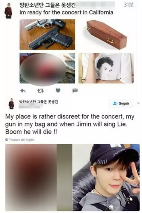 Twitter賬號名為「防彈少年團他們長得好醜」的用戶留言道:「4月1日舉辦的防彈少年團演唱會上要殺了Jimin。」並貼出槍支和演唱會座位圖的照片,在大家都以為是愚人節開的玩笑時,他又再次留言:「不要無視威脅,因為我和共犯們將回去防彈少年團的演唱會,盡我們所能打死Jimin。」許多粉絲站就寫郵件給所屬公司,希望能保護好自己的偶像。