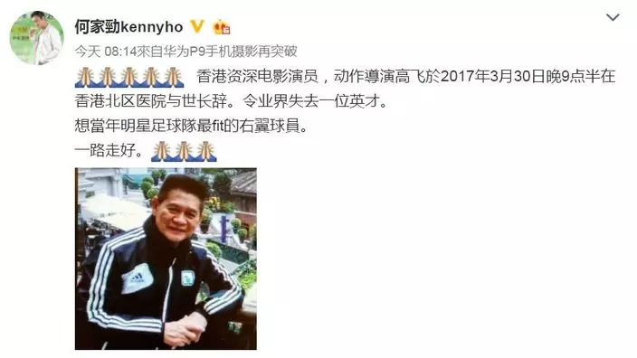 何家勁微博貼文悼念高飛。(何家勁微博圖片)