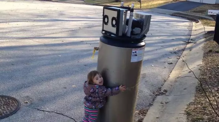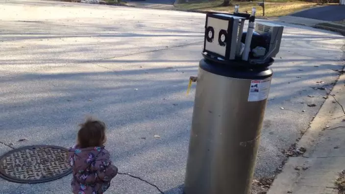 這名小女孩名叫雷娜(Rayna),當時她在路上看見一台廢棄的熱水器,便立即被吸引住,但她卻將熱水器誤認成機器人,停下來和它打招呼,不斷說道「你好,機器人!」「我愛你,機器人!」並張開雙手擁抱,將它當成是自己的好朋友一般。