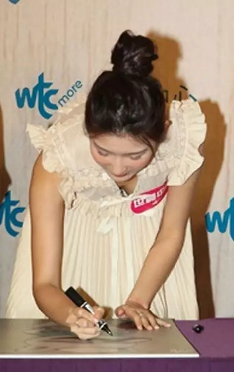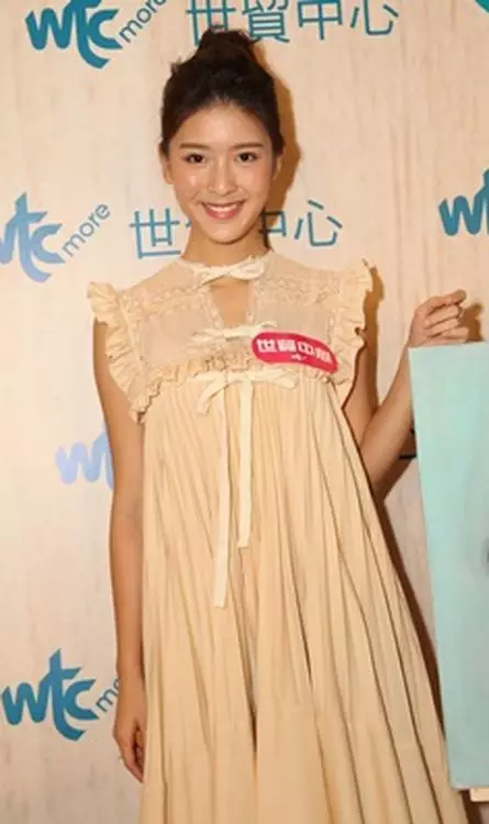 余香凝身穿米色通花裙出席活動,當她彎身畫畫時不慎走光。