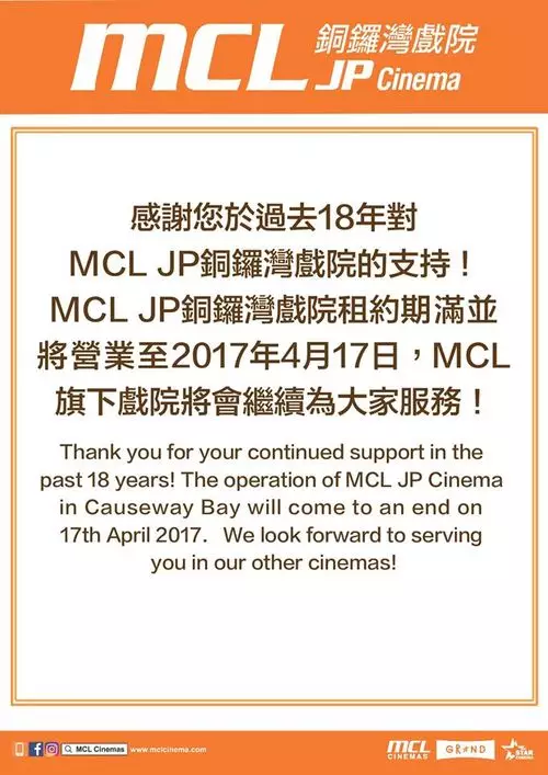 MCL Cinemas旗下的MCL JP銅鑼灣戲院因租約期滿,將營業至下周一(17日)後結束營業。