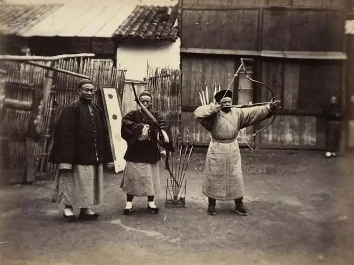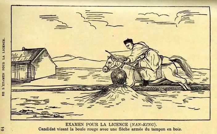 到了清代,武舉地位大大提升,更注重武藝考核。內容豐富,難度係數也較高,分為步射、騎射、舞刀、舉石等項。在1885 年,曾有法國人在南京觀看武舉省試,將之圖文並茂記錄了下來。在眾多考核內容中,最有趣的一項是「射地球」,要求應試者必須在騎馬狀態下用特殊形狀的箭頭把皮球從隆起的小土堆上射下來。如果弓力不足或精度不準很難成功。清代武舉,雖與宋明不同,但也只是選拔出一批氣力大、善弓馬的勇士,沒有產生戰績卓越的名將。