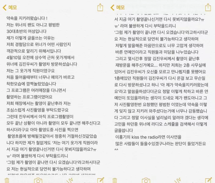 女網友就表示自己又再度請求金秦禹,「我是這家店的職員,如果這裡的拍攝結束了,就再也看不到你了」。隨後金秦禹就表示等拍攝結束後他會再度回來的,女網友在信中寫道:「我理所當然的覺得這是不太可能,但他能這樣說我也覺得非常感激。」但想不到的是幾個鐘頭之後金秦禹拍攝結束,他真的再回來了,一樓的職員就問金秦禹為什麼返來,金秦禹說:「我為遵守約定而來。」金秦禹遵守約定的行為令很多聽眾都很感動,大讚現在還能有偶像能遵守約定真的很難得。