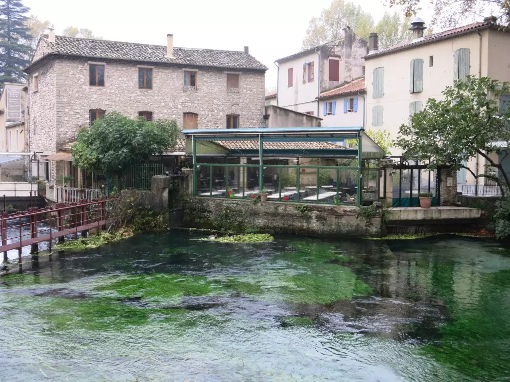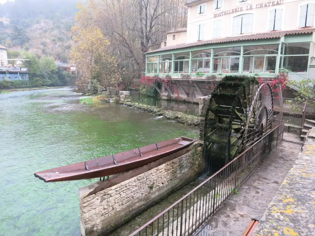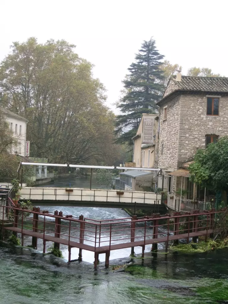 Vaucluse 在拉丁文的意思是封閉的山谷,這裡以此命名,因為河谷本身是個死胡同,遊人逆流而上,走到盡頭面對的是個峭壁,峭壁底下有個山洞,而山洞便是河水的源頭。我們到的時候是乾旱期,看不到泉水,據說,大水期會看到噴泉式湧現的奇觀。