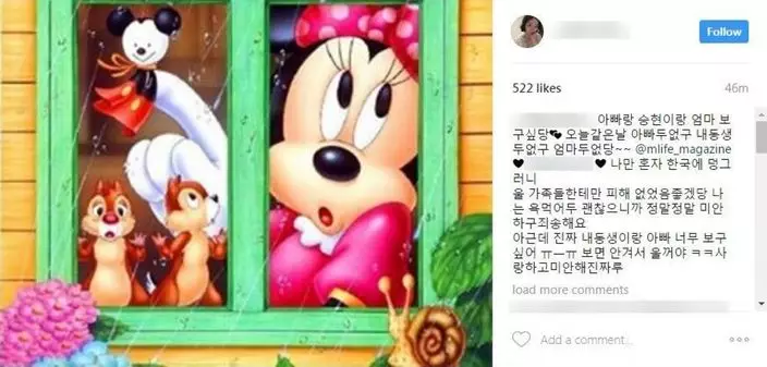 黃荷娜表示父母與弟弟都在海外,只有自己韓國,自己被罵是沒關係,但不希望家受到傷害。還上載米妮在窗前掛上米奇造型的晴天娃娃圖片,而朴有天的藝名就是「Mickey有天」,黃荷娜似乎有所暗示!