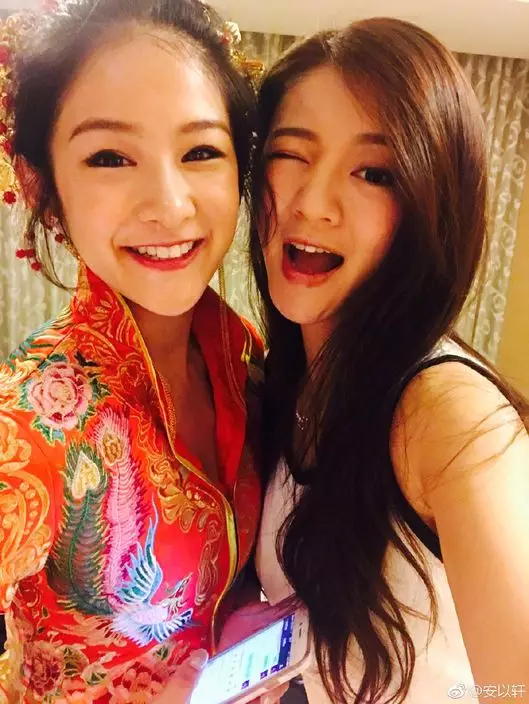 照片中,向以丞穿著一身低胸的大紅色中式禮服,玲瓏浮突的身材若隱若現,與安以軒頭貼頭自拍。可見二人都擁有白皙的肌膚、大眼、高鼻,看起來還相似,網友都紛紛留言,大讚二人都遺傳到高顏值。