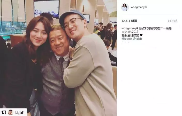 Venus轉發曾國祥上載的三人合照,並留言說:「我們的眼都笑成了一條線 14.04.2017 老爺生日快樂 」不少網民恭喜她之外,亦有人追問她是否已做了曾家新抱「咁快老爺??」、「嫁咗啦叫老爺?」